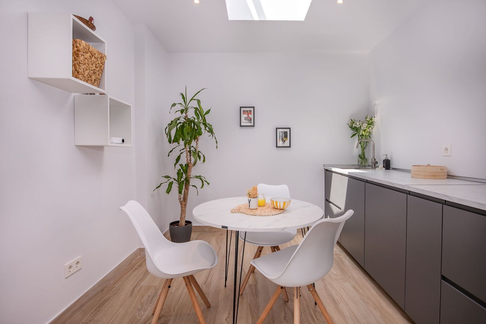 The entrance level of the house includes a new fully fitted kitchen, open to the living room and a spacious terrace, and a guest toilet.