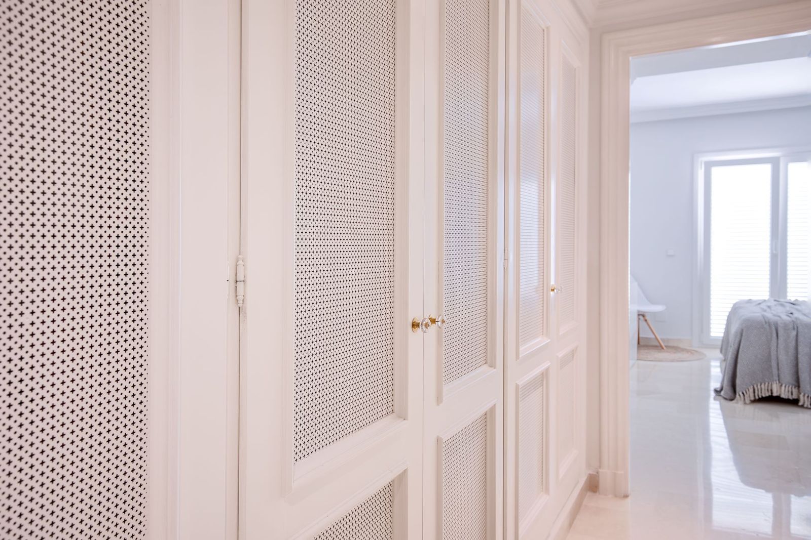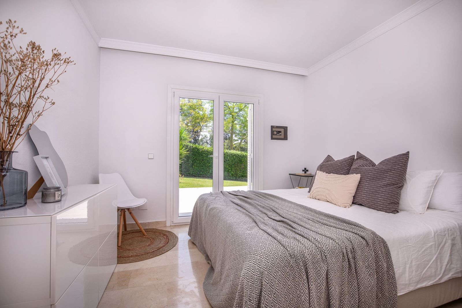The master bedroom with en suite bathroom and the two other bedrooms sharing a bathroom are located on the lower level, with direct access to a well-kept private garden and two terraces.