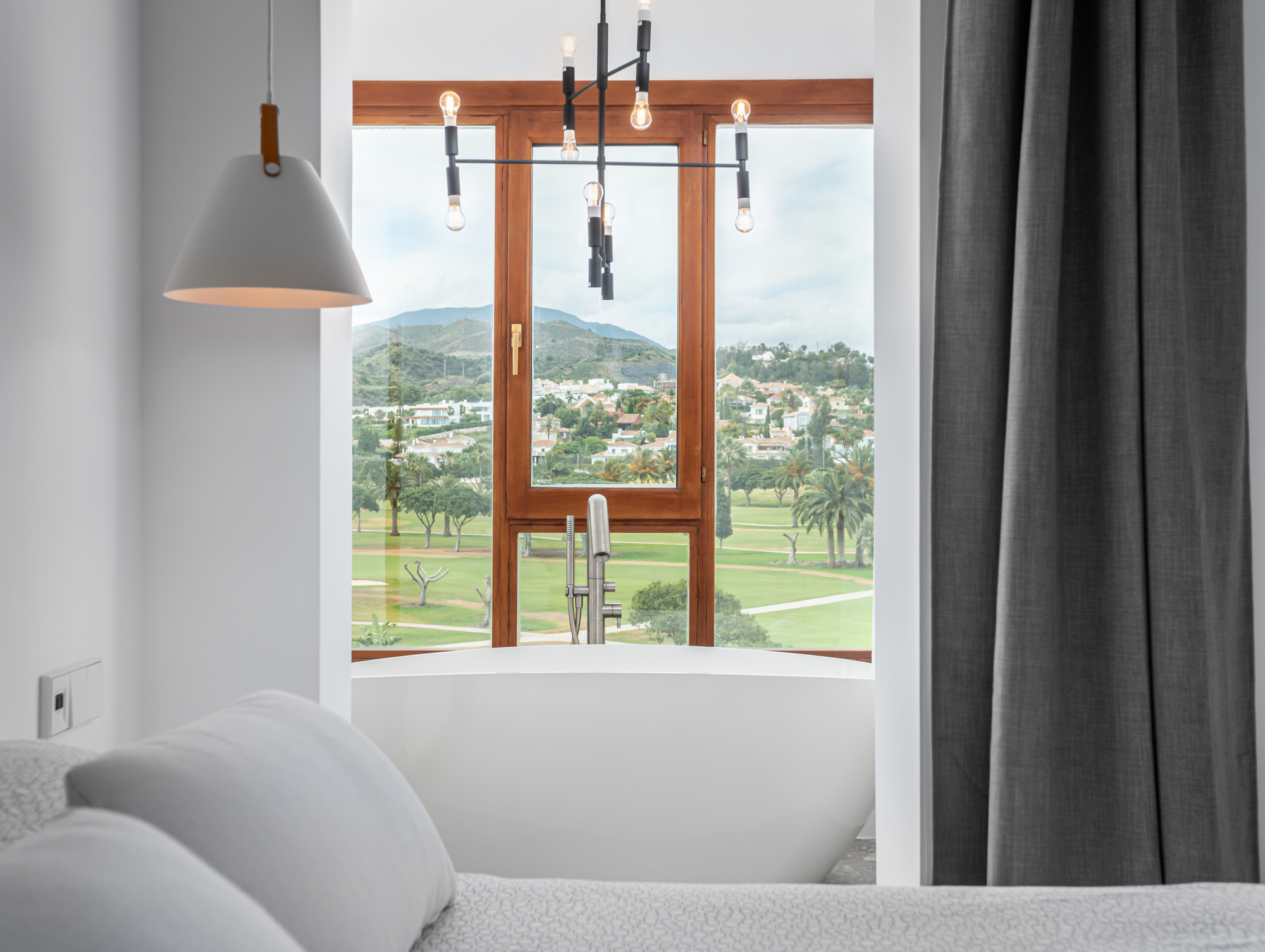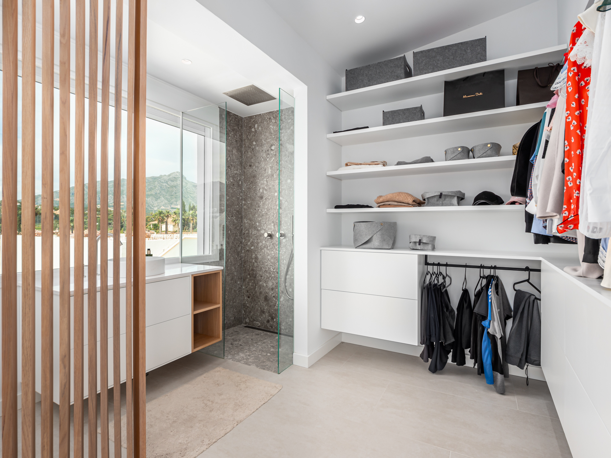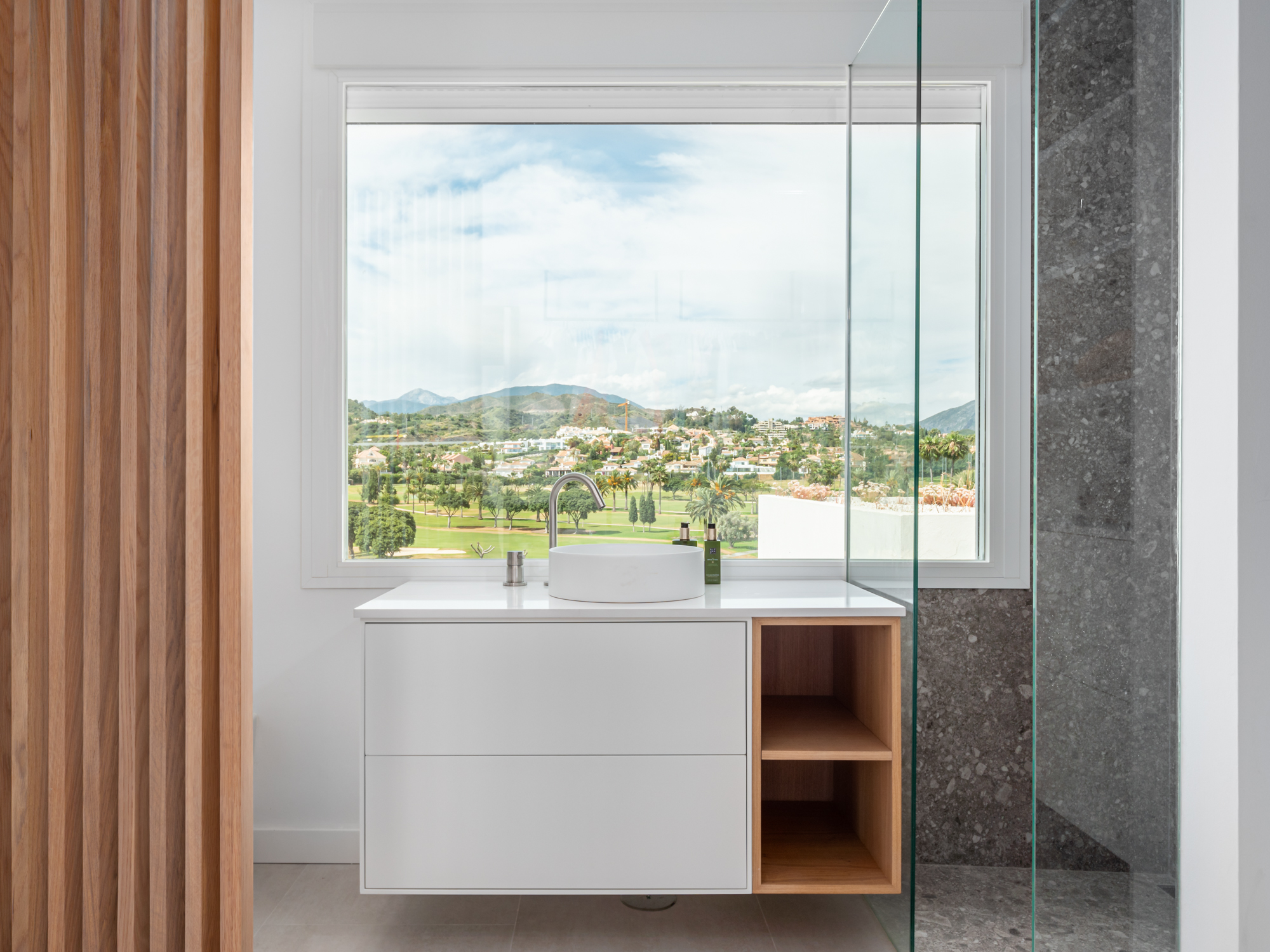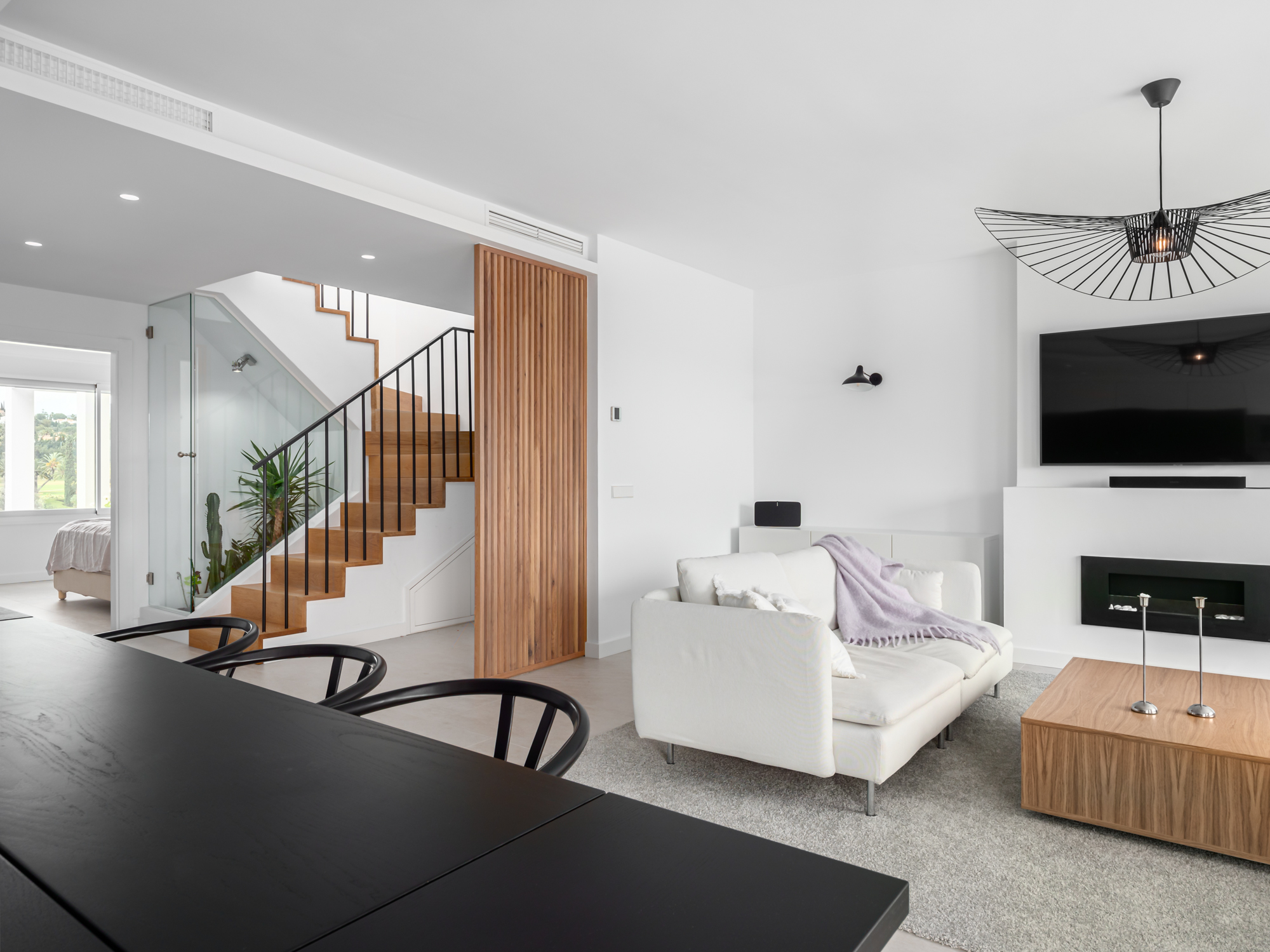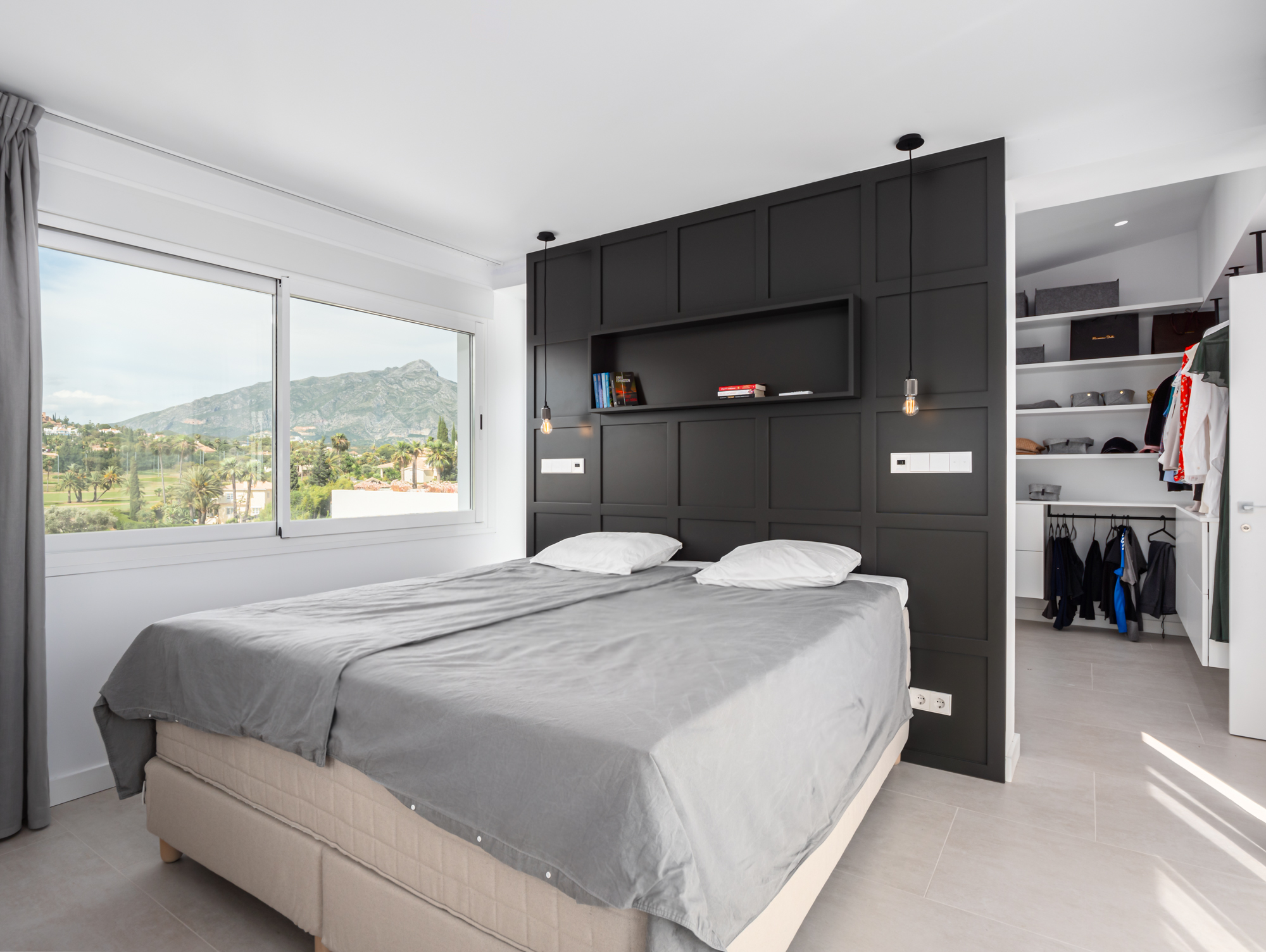 The first floor of the penthouse has a stylish open plan with smart appliances and unique details. With a large kitchen with a grand table that seats eight. Living room with open fireplace, large TV, and sofas. Additionally, it is equipped with glass doors that provide direct access to the lower floor terrace, offering captivating sea views. There are also two stunningly designed bedrooms with king-size beds. The first bedroom includes a spacious closet, a bathtub with a golf course view, and direct bathroom access. The second bedroom is equally impressive, with a spacious bed and ample closet space. The top floor features a luxurious master bedroom with an open closet and a suite bathroom. It also offers direct access to the rooftop, while maintaining your own privacy.
