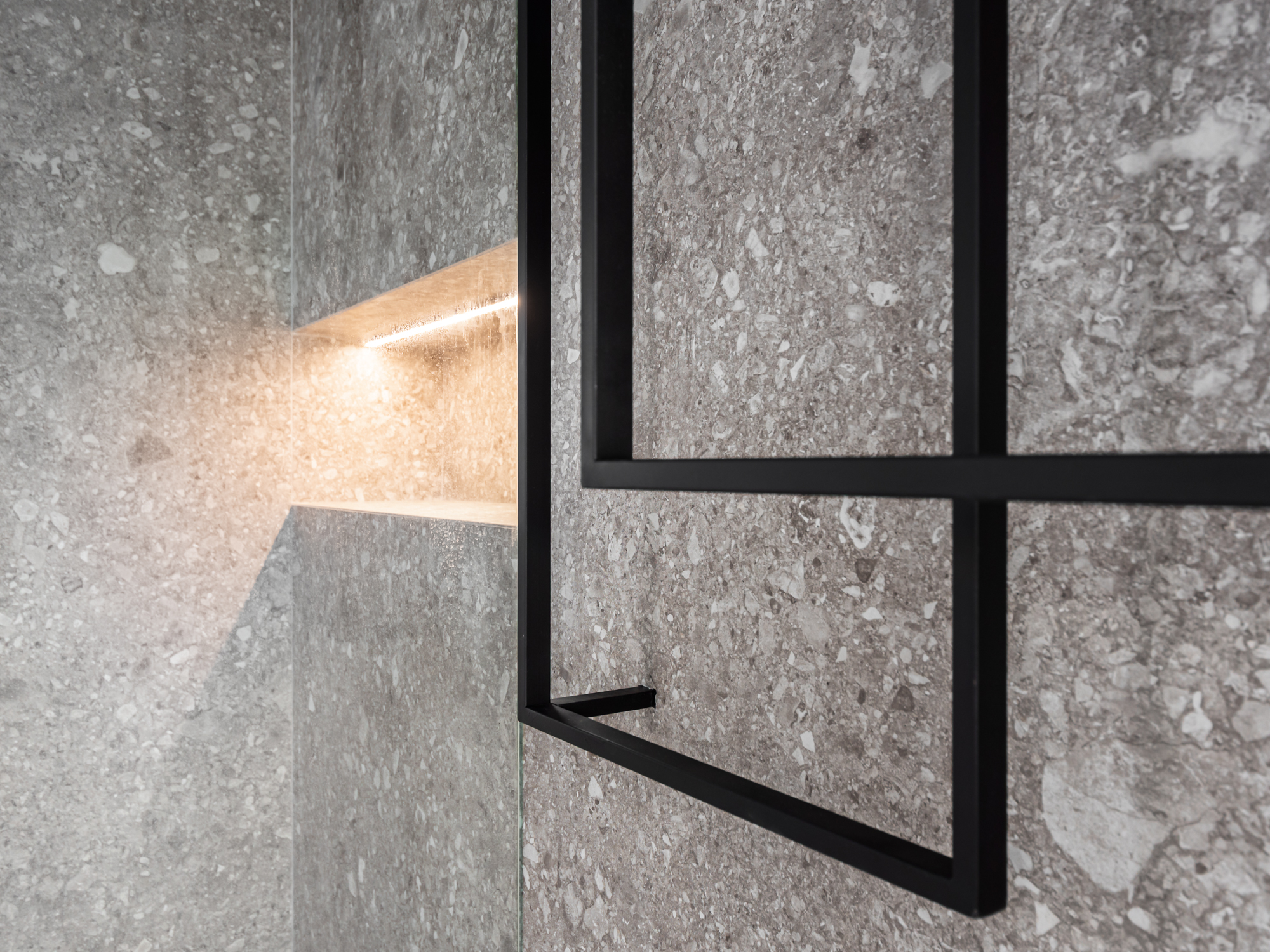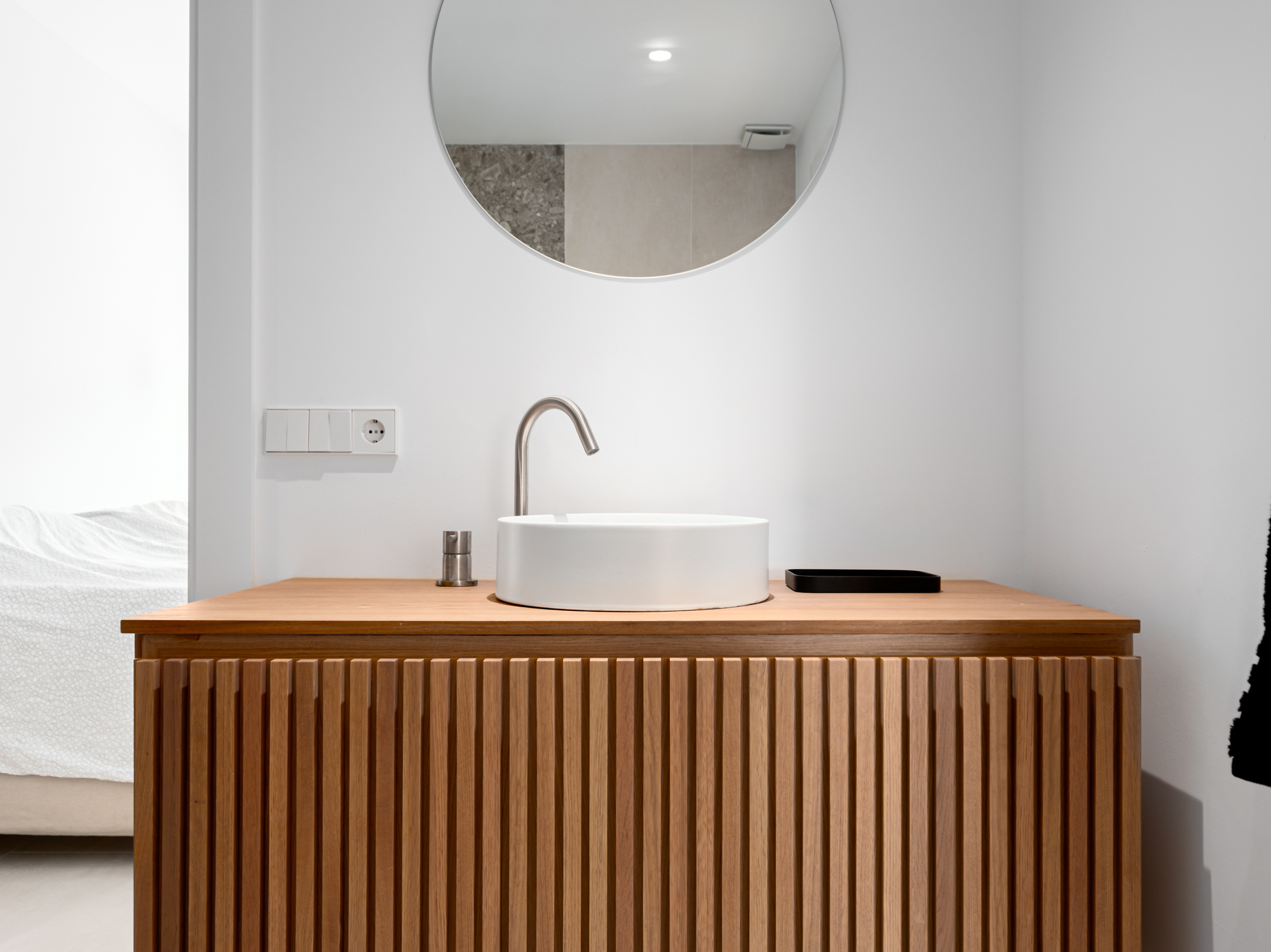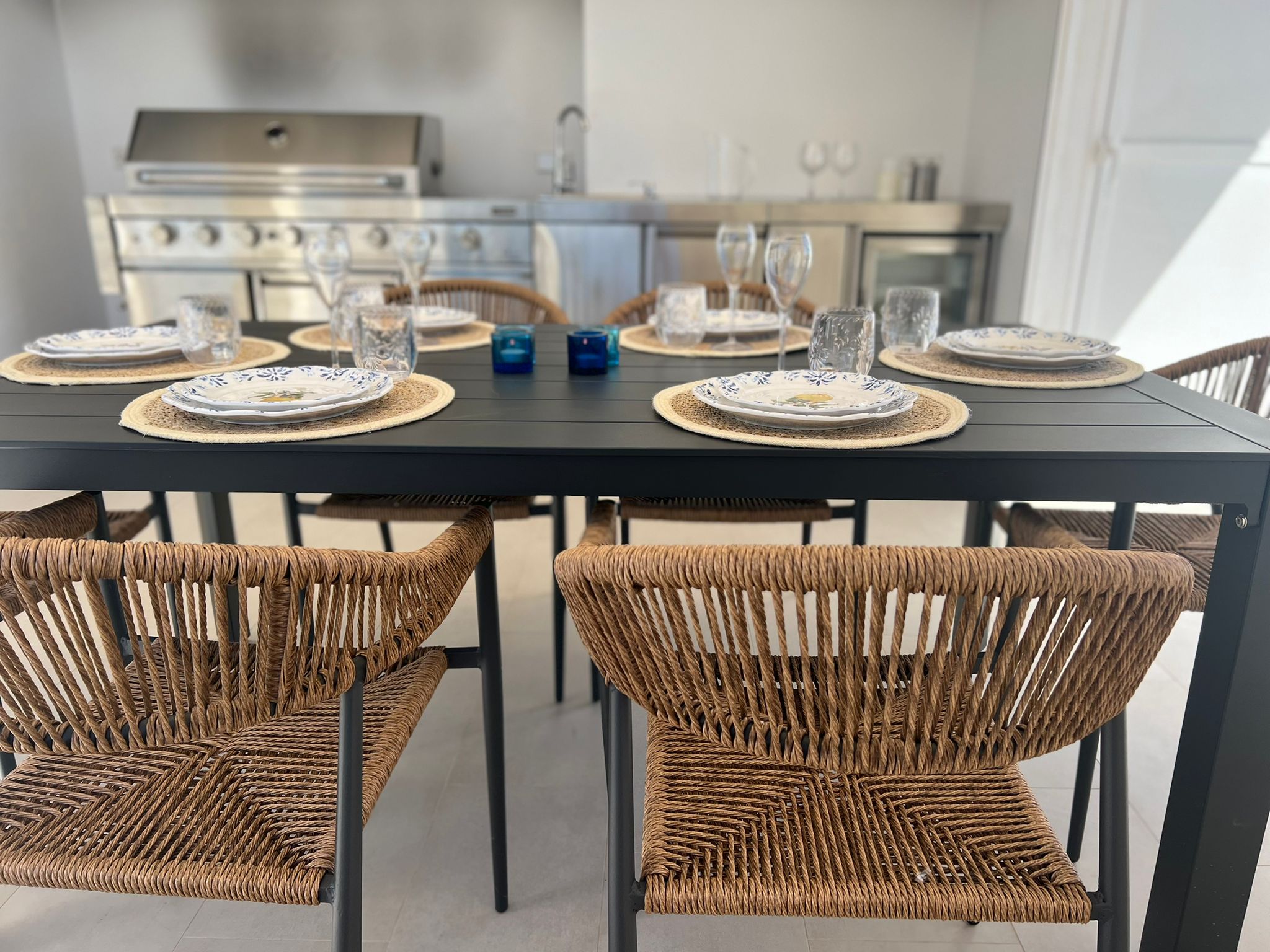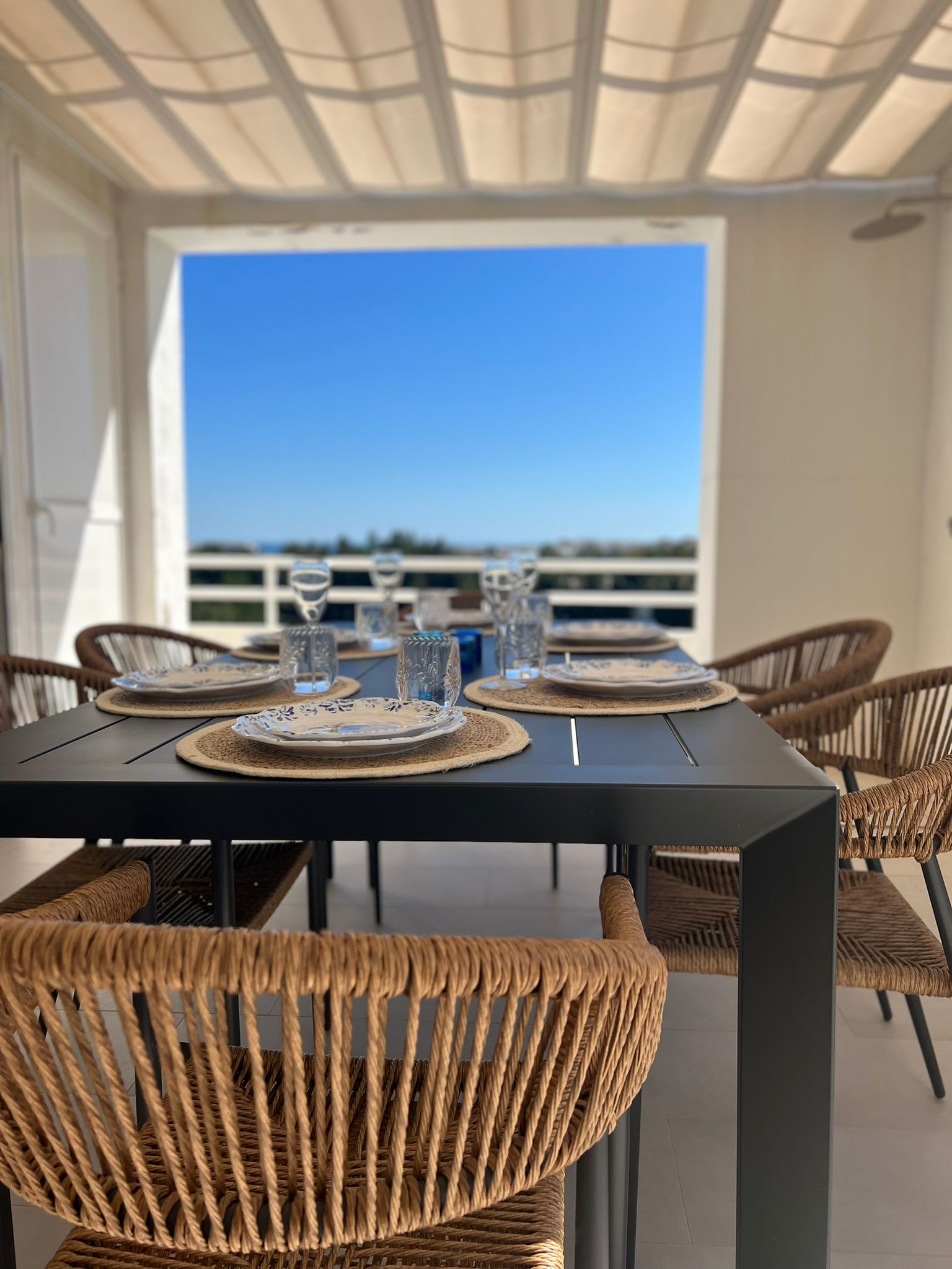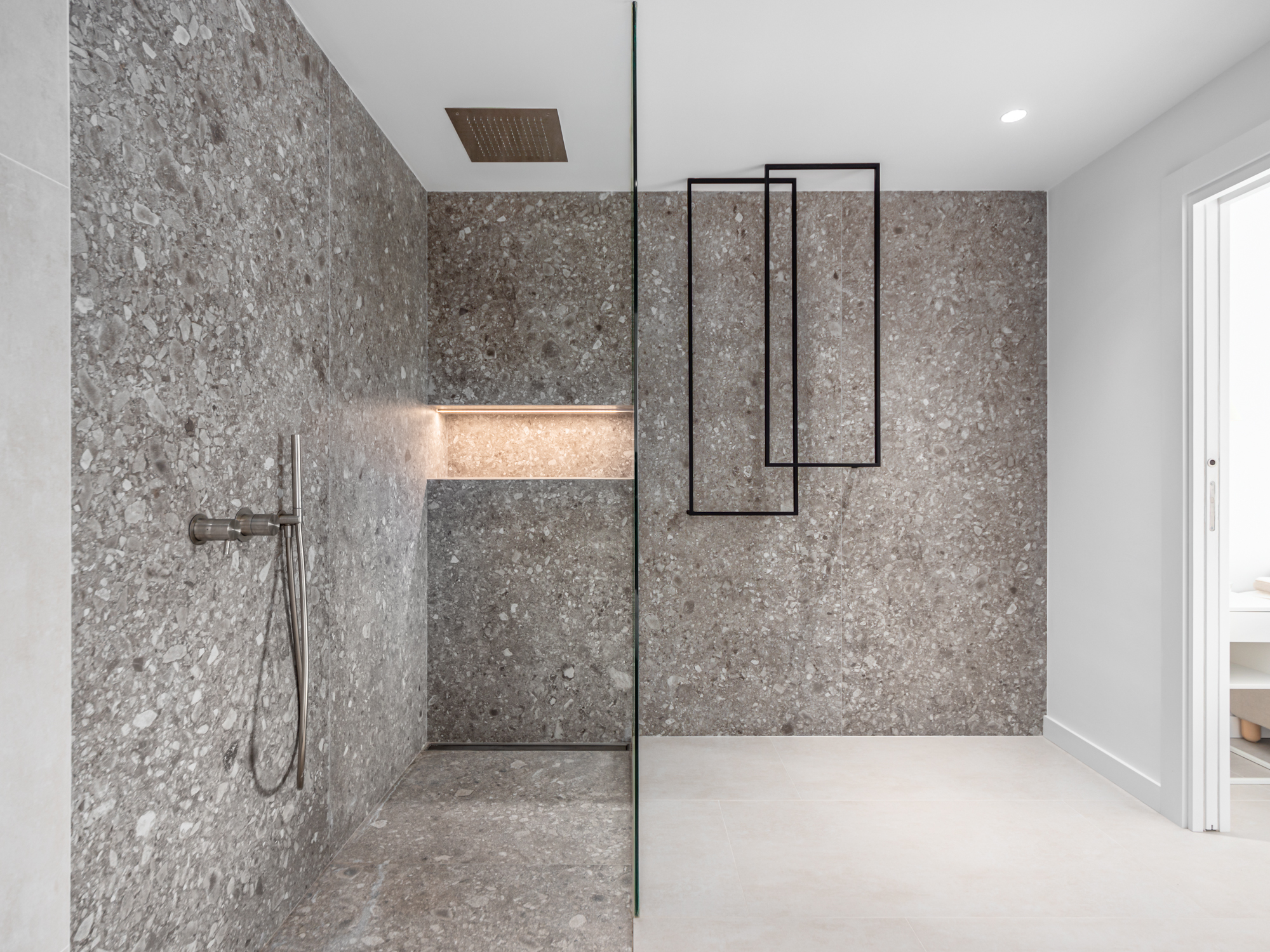 The first floor of the penthouse has a stylish open plan with smart appliances and unique details. With a large kitchen with a grand table that seats eight. Living room with open fireplace, large TV, and sofas. Additionally, it is equipped with glass doors that provide direct access to the lower floor terrace, offering captivating sea views. There are also two stunningly designed bedrooms with king-size beds. The first bedroom includes a spacious closet, a bathtub with a golf course view, and direct bathroom access. The second bedroom is equally impressive, with a spacious bed and ample closet space. The top floor features a luxurious master bedroom with an open closet and a suite bathroom. It also offers direct access to the rooftop, while maintaining your own privacy.